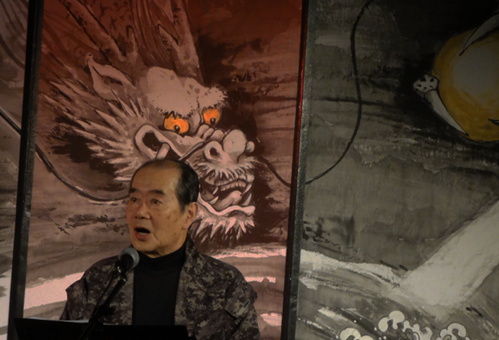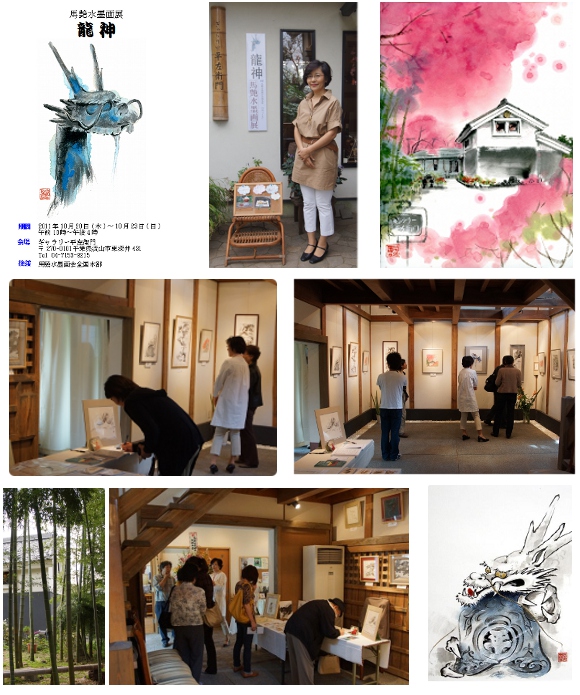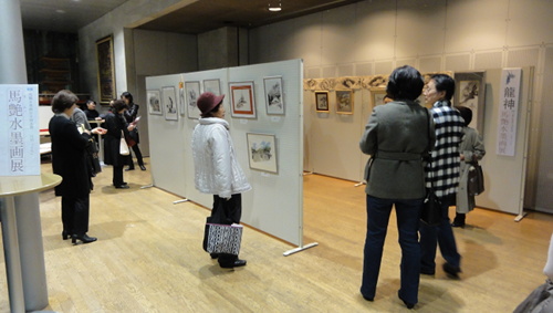 朗読公演会場の外ホールでは、馬艶水墨画展「龍神」を設け、