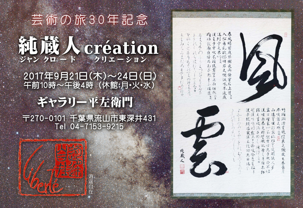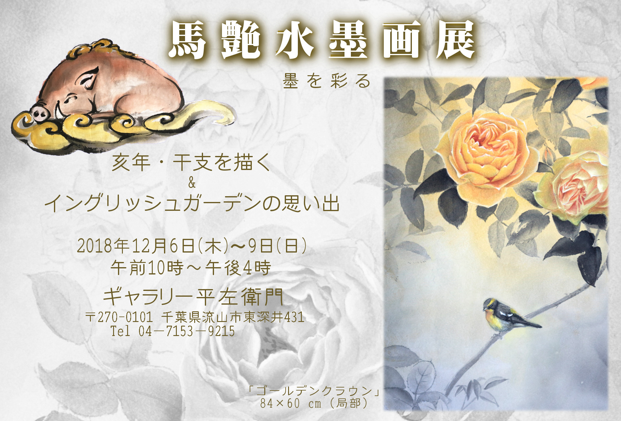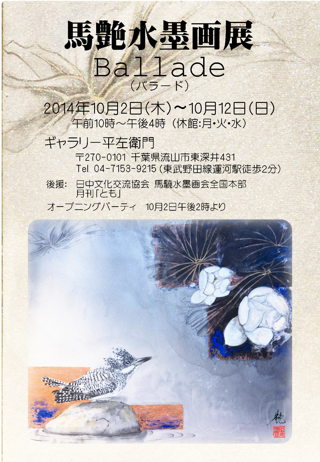 会場:ギャラリー平左衛門 〒270-0101 千葉県流山市東深井431 Tel 04-7153-9215(東武アーバンパークライン線運河駅徒歩2分。茶房「さわ」併設)