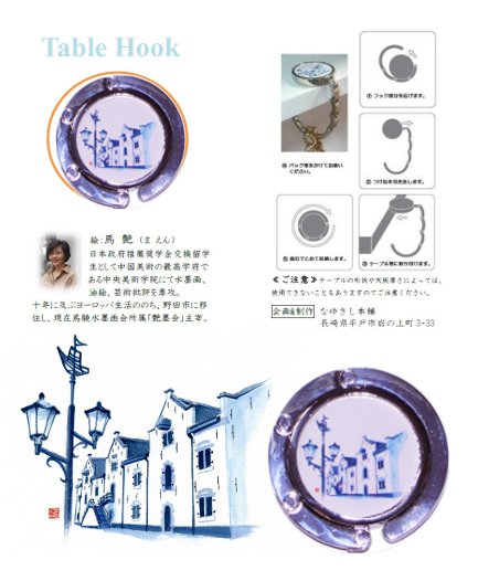 このテーブルフックは長崎県平戸オランダ商館ミュージアムショップ、松浦史料博物館や平戸市内観光協会ホテルなどで販売されています。「平戸オランダ商館」(国指定史跡復元建造物)は、1639年に作られた巨大な石造倉庫、日本ではじめての洋風建造物でした。海の町・平戸の歴史を体験できる場として復元され2011年9月にオープン。有田焼の影響を受けているオランダのデルフトブルー(藍色の焼き物)をイメージして図案デザインしました。